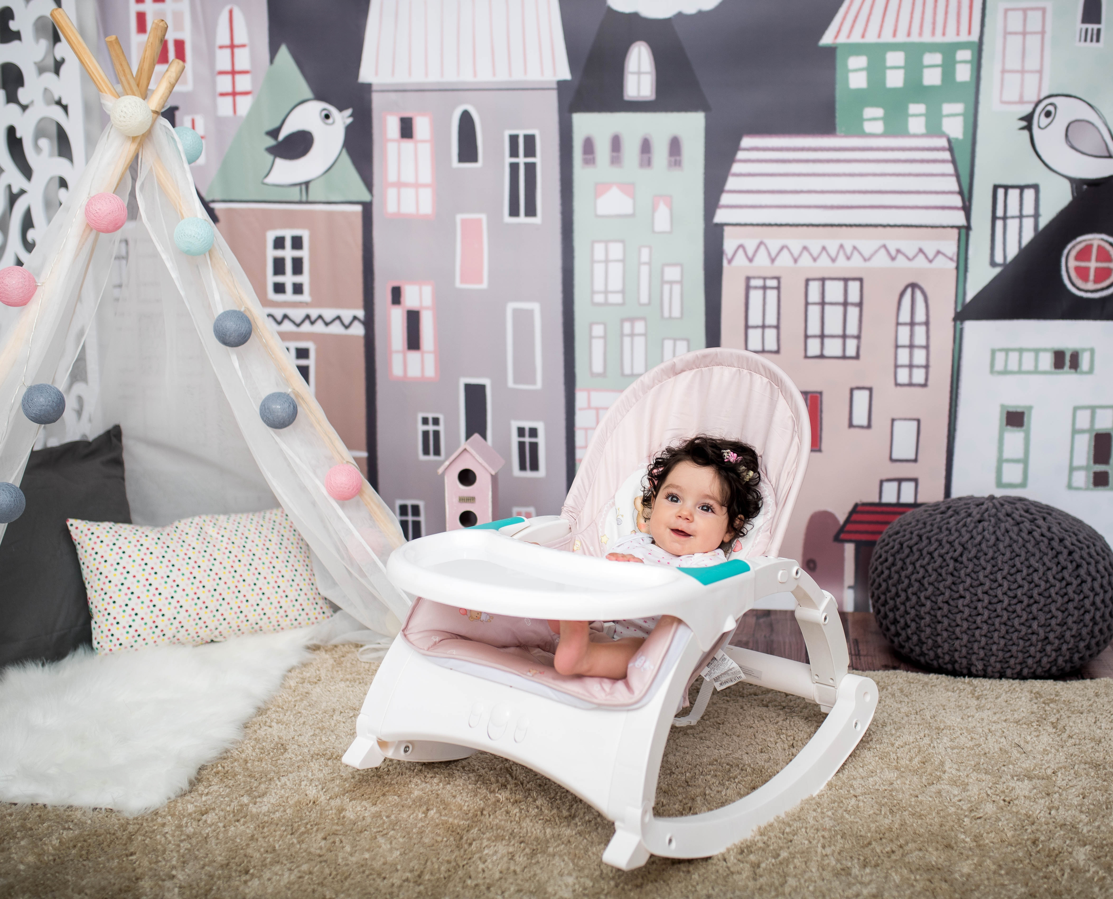 Fotoliul balansoar cu masuta, vibratii si muzica Alex este conceput pentru odihna, joaca si servit masa. Sezutul si spatarul confortabile si reglabile, impreuna cu bara cu jucarii tentante si tavita pentru servit masa sau joaca, asigura odihna si relaxarea bebelusului, oferind astfel timp liber parintilor.