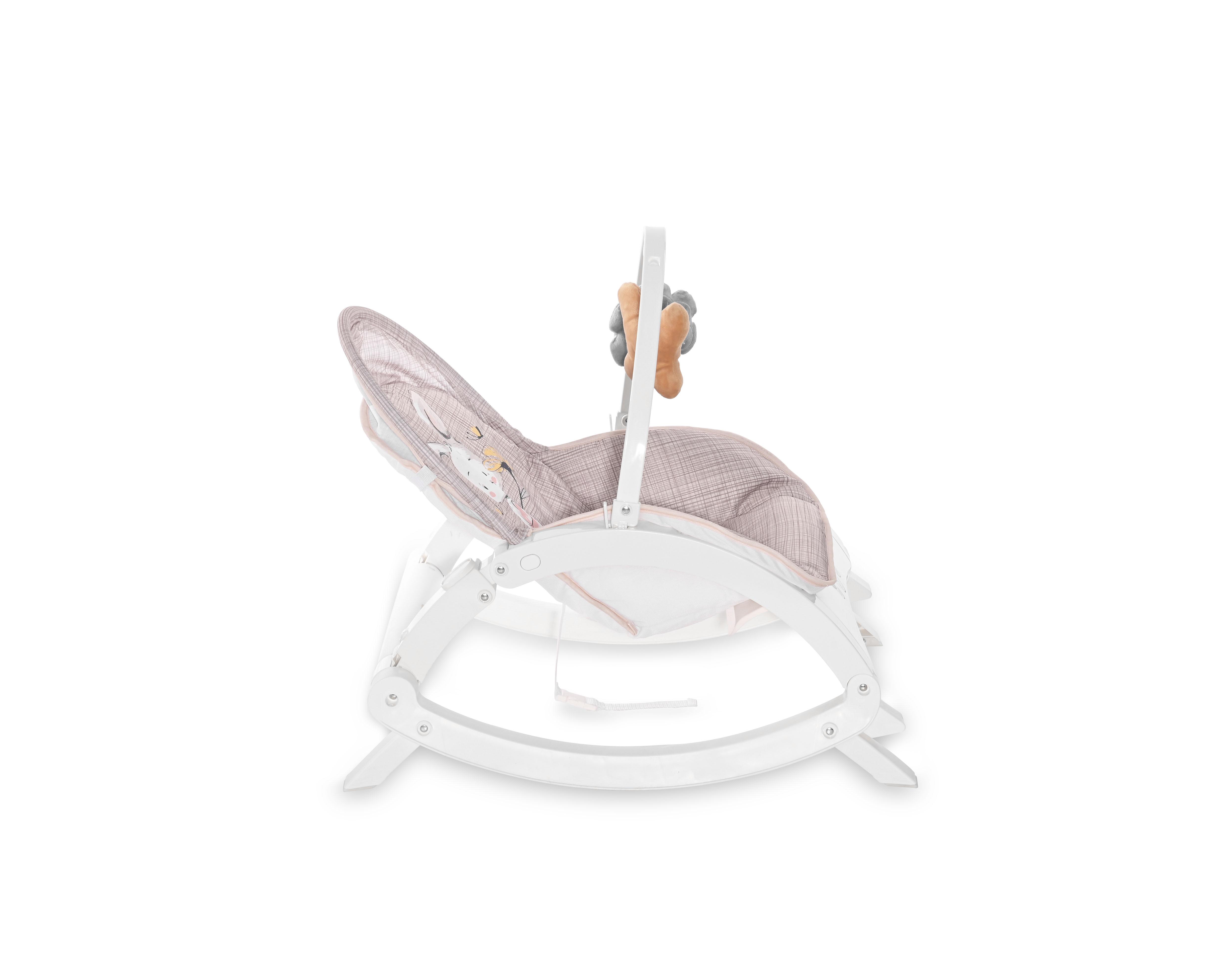 - Spatarul este reglabil pe multiple pozitii (nou-nascut, bebelus si junior). Ultima pozitie se regleaza cu ajutorul unor centuri dispuse in spatele balansoarului. In acest mod balansoarul poate fi folosit si ca scaun .